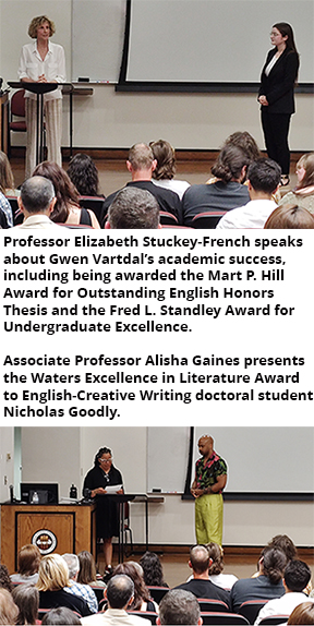 Among the undergraduate honorees for the 2023-24 academic year were Andy Mills, who earned both the Fred L. Standley Award for Undergraduate Excellence and the Edward H. and Marie C. Kingsbury Achievership Award. Additionally, Gwen Vartdal was named the Mart P. Hill Award winner for Outstanding English Honors Thesis, and she earned the John and Susan Ausley Scholarship. Ariana White won the Gerald Ensley Emerging Journalist Award, and Sydney Cole was awarded the Waters Fund for Excellence in Literature.