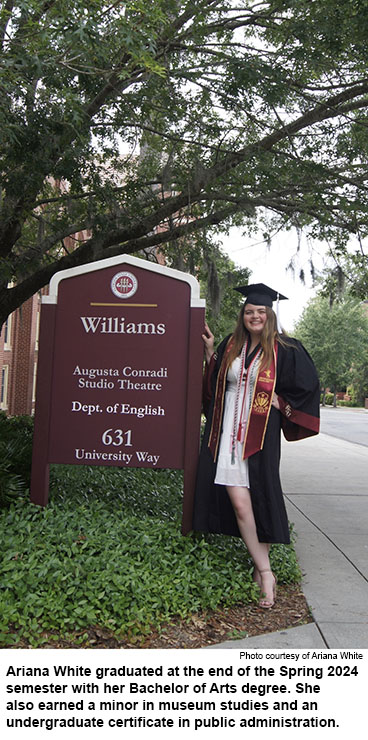 Ariana White is a diligent and gifted former English-Editing, Writing, and Media student, who graduated from Florida State University at the end of the Spring 2024 semester with her Bachelor of Arts degree. She also earned a minor in museum studies and an undergraduate certificate in public administration.