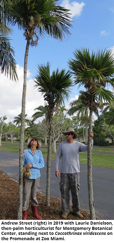 His knowledge about palms and curious nature even turned one of his regular trips to Zoo Miami into a historic event. In February 2012, while walking through the zoo’s parking lot, Street saw a palm he had not noticed before. To the untrained eye, the palm might have looked no different from any other, but Street saw something special.