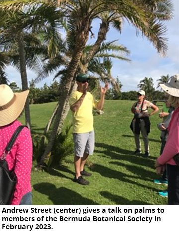 While Street was visiting Bermuda in 2023, he assessed palm collections at the Bermuda Botanical Society and other government parks and private gardens. Bermuda has strict laws to keep its native plants safe, and the workers for the society asked Street to help them better preserve the palms on various properties.