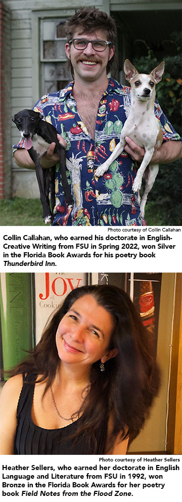 The Florida Book Awards recently recognized two Florida State University Department of English alumni within the Poetry section of the organization’s 2022 awards. Collin Callahan, who earned his doctorate in English-Creative Writing in Spring 2022, won the Silver Medal for his poetry book Thunderbird Inn, released in May 2022. Heather Sellers, who earned her doctorate in English Language and Literature in 1992, won the Bronze Medal for her poetry book Field Notes from the Flood Zone, released in April 2022.
