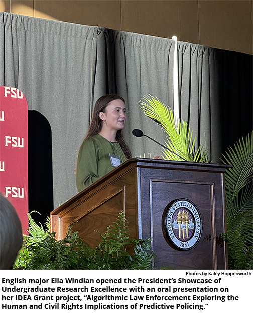 English-EWM major Ella Windlan presents her research findings on predictive policing, civil rights at 2024 President’s Showcase