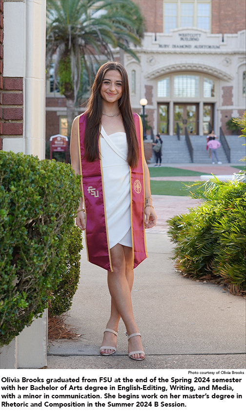 Brooks graduated from Florida State University at the end of the Spring 2024 semester with her Bachelor of Arts degree in English-Editing, Writing, and Media,