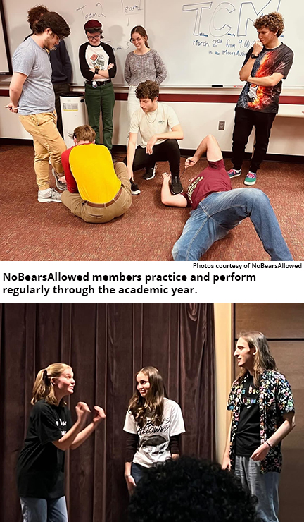 “No Bears has given me a space to get out of my head and trust my intuition,” says Dylan Fishman, a senior who is majoring in English-Creative Writing. “The environment is so goofy and but there’s also a lot of craft behind it. We’re trying to make each other laugh, but more importantly, we’re trying to tell a story, which is my favorite aspect.”