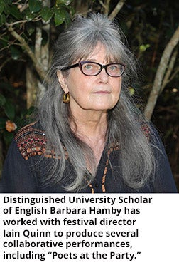 Distinguished University Scholar of English Barbara Hamby has worked closely for the past three years with Iain Quinn, the festival’s director, to stage this annual collaboration. When Quinn asked Hamby what this year’s theme should be, she immediately thought, “party poems.”