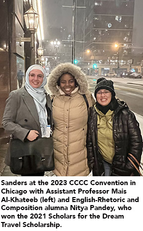 Sanders’ most recent research project was one of 20 selected for the 2024 Conference on College Composition and Communication’s Scholars for the Dream Travel Scholarship. First conceptualized in the spring of 2023 when Sanders and English Assistant Professor Ronisha Browdy’s research interests merged to create an exploration of “The Abundance of Global Black Rhetorics,” the investigation emphasizes the importance of claiming sisterhood as a black feminist rhetorical practice.
