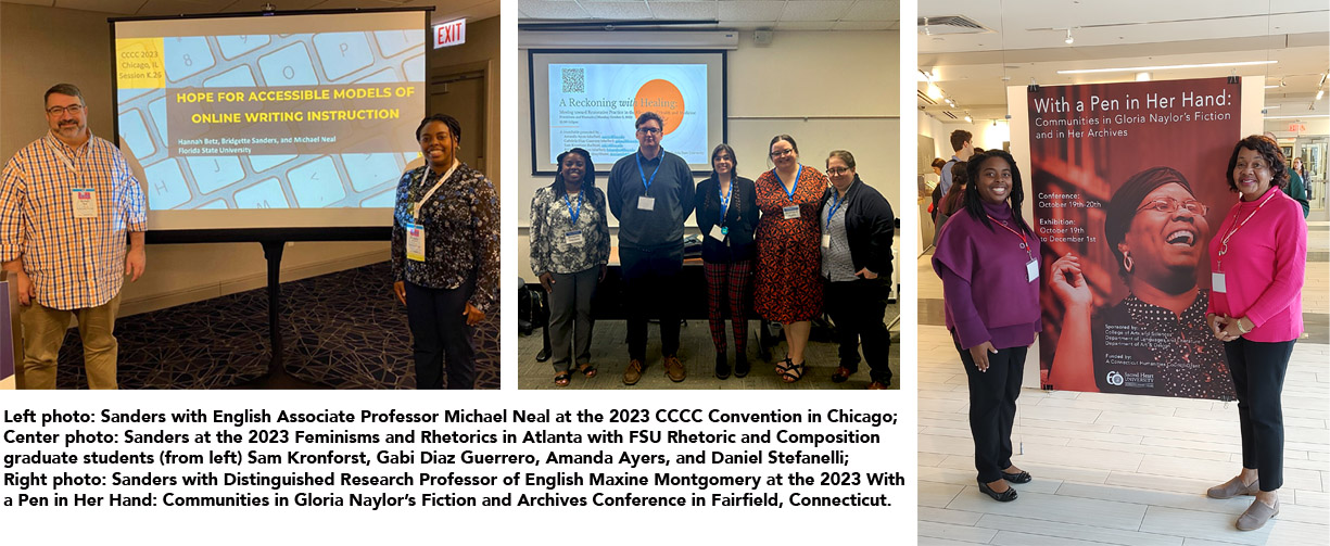 Now, as she develops her dissertation, Sanders works on smaller-scale, independent research projects with her peers and English faculty members. In April of 2023, she was finishing a project with FSU English Associate Professor Michael Neal, director of the Rhetoric and Composition Program and her dissertation chair. The project also included FSU graduate student Hannah Betz. Their study analyzed accessibility between asynchronous, synchronous, and