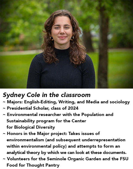 Sydney Cole, a junior who is a double major in English-Editing, Writing, and Media and sociology, earned the honor as a Student Star. Her school-life balance is impressive considering just how much she has been able to take on since her first year at FSU. She is a Presidential Scholar, an avid environmental researcher, community service organizer, and a member of the FSU’s Swimming and Diving team, showing that Cole is making the most out of her undergraduate experience. Following her Student Star highlight in July 2023, English major Emily Valmana interviewed Cole about how she balances her studies as an English major with each of her other student roles on campus.