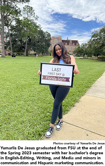 Yumarlis De Jesus—she likes to be called Yumi—graduated from Florida State University at the end of the Spring 2023 semester with her bachelor’s degree in English-Editing, Writing, and Media and minors in communication and Hispanic marketing communication. She began taking classes with the Center for Academic Retention and Enhancement Department in 2019.