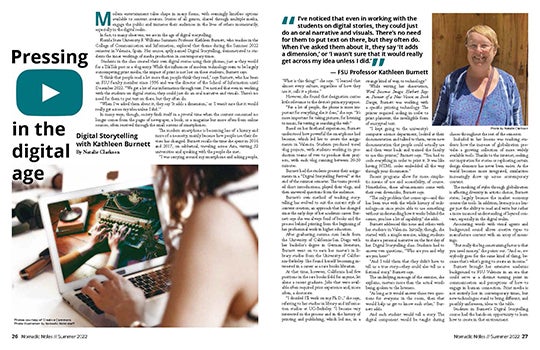Kathleen Burnett’s Digital Storytelling course explored creativity in modern times. Read the article in pages here; see the full page design here.